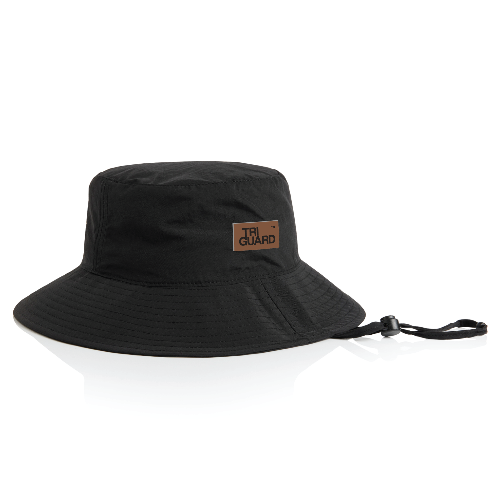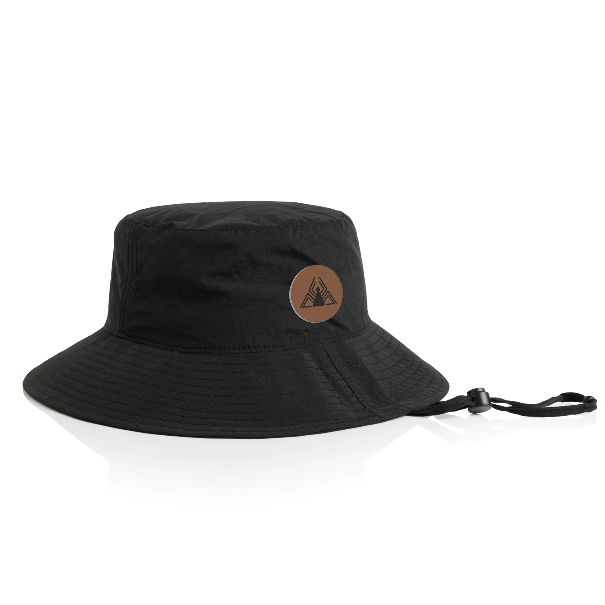 Reinforced large brim with stitching detail, side eyelets, self-fabric chin strap, plastic adjustable toggle